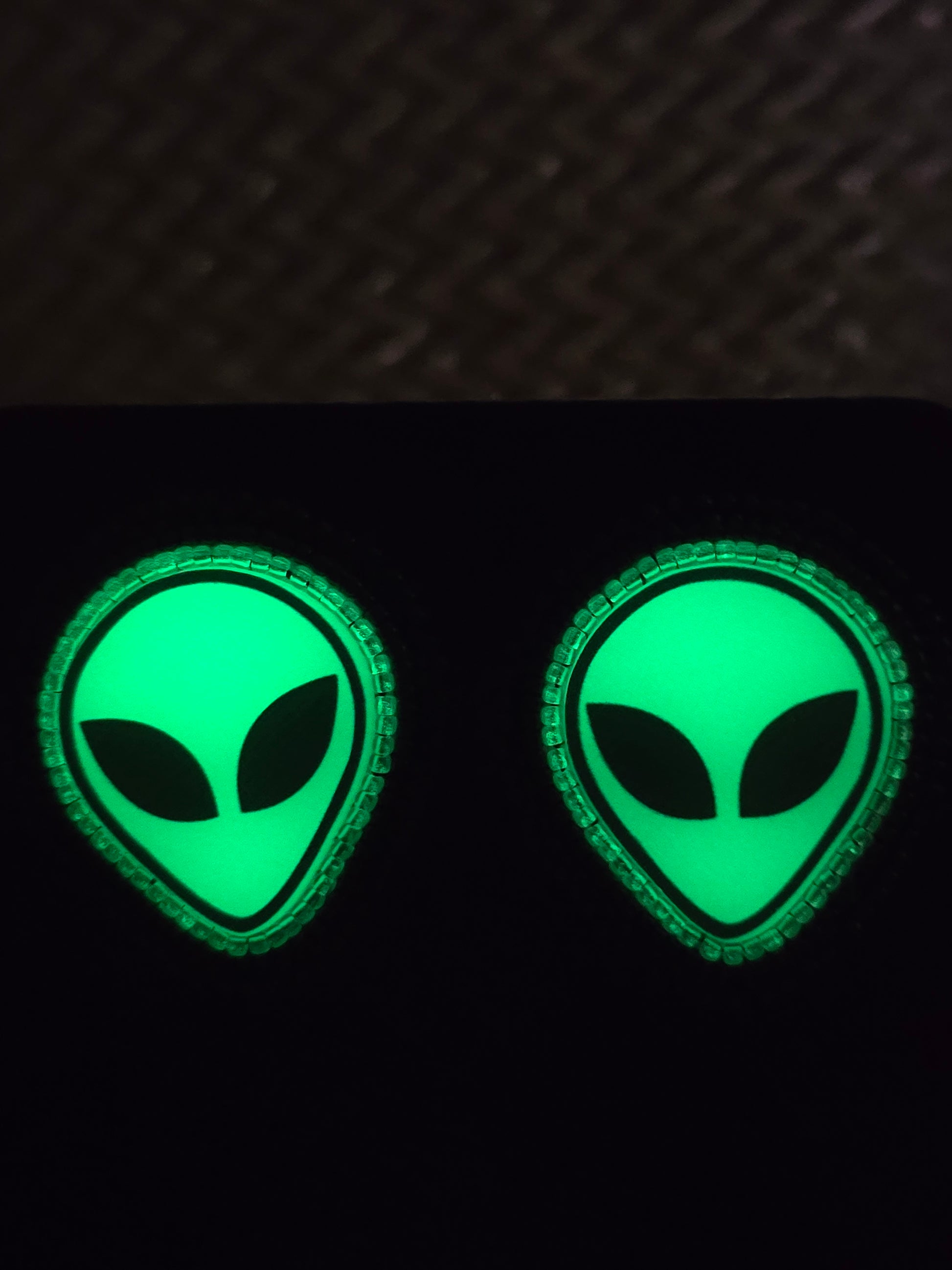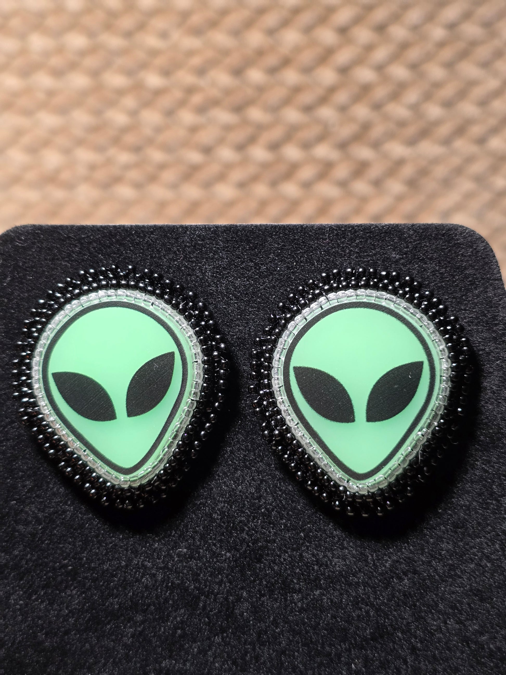 Glow in the dark alien head with black and crystal glow in the dark 11/0 jsb beads. Backing is stitched black faux leather. Stainless Steel post