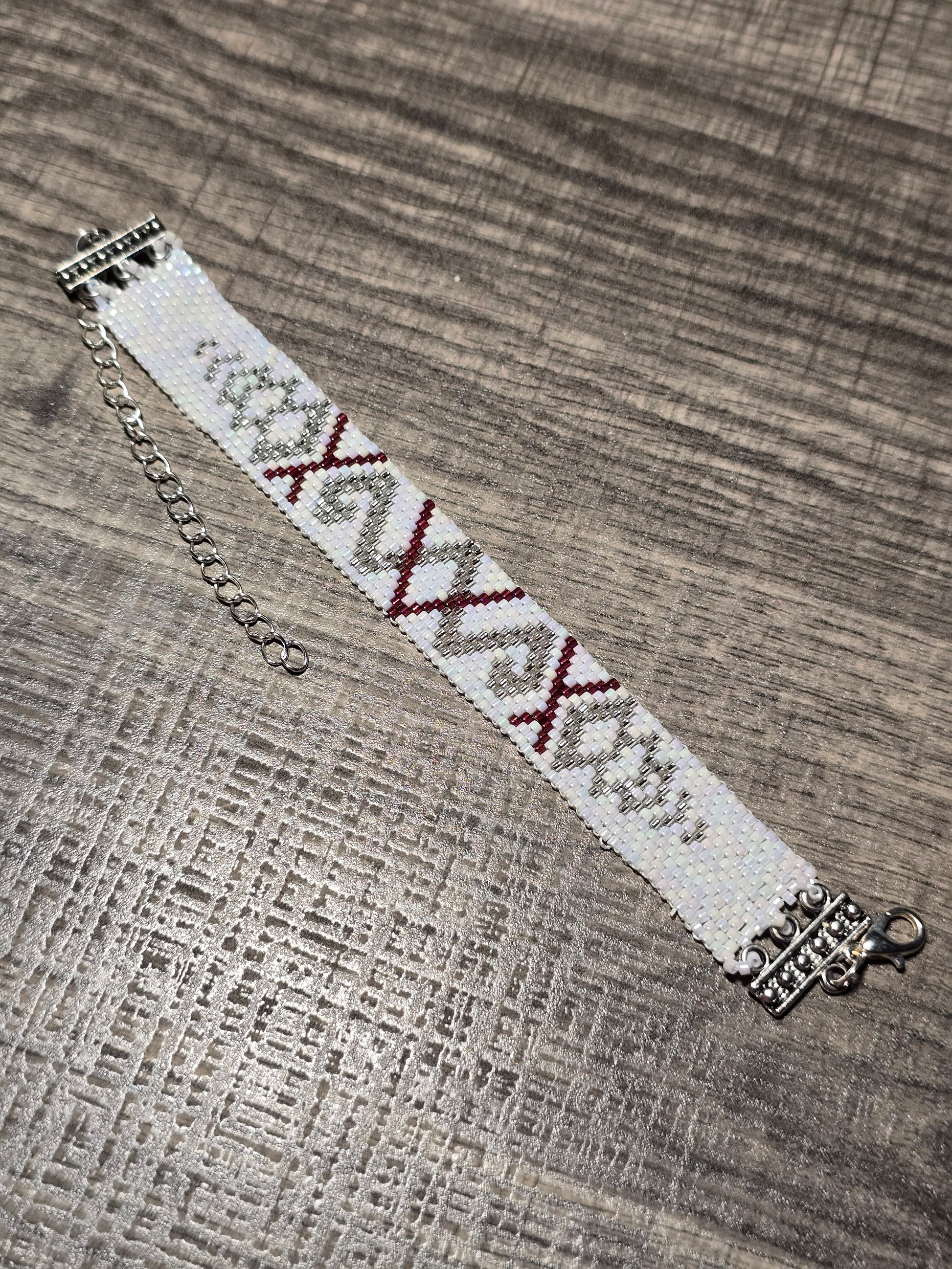 Intergerning design made with 11/0 miyuki delica beads of white pearl ab, crystal silver lined, and gold luster transparent red. Antique silver colored bar end with extension chain and lobster clasp. Length size 6.5" to 9".