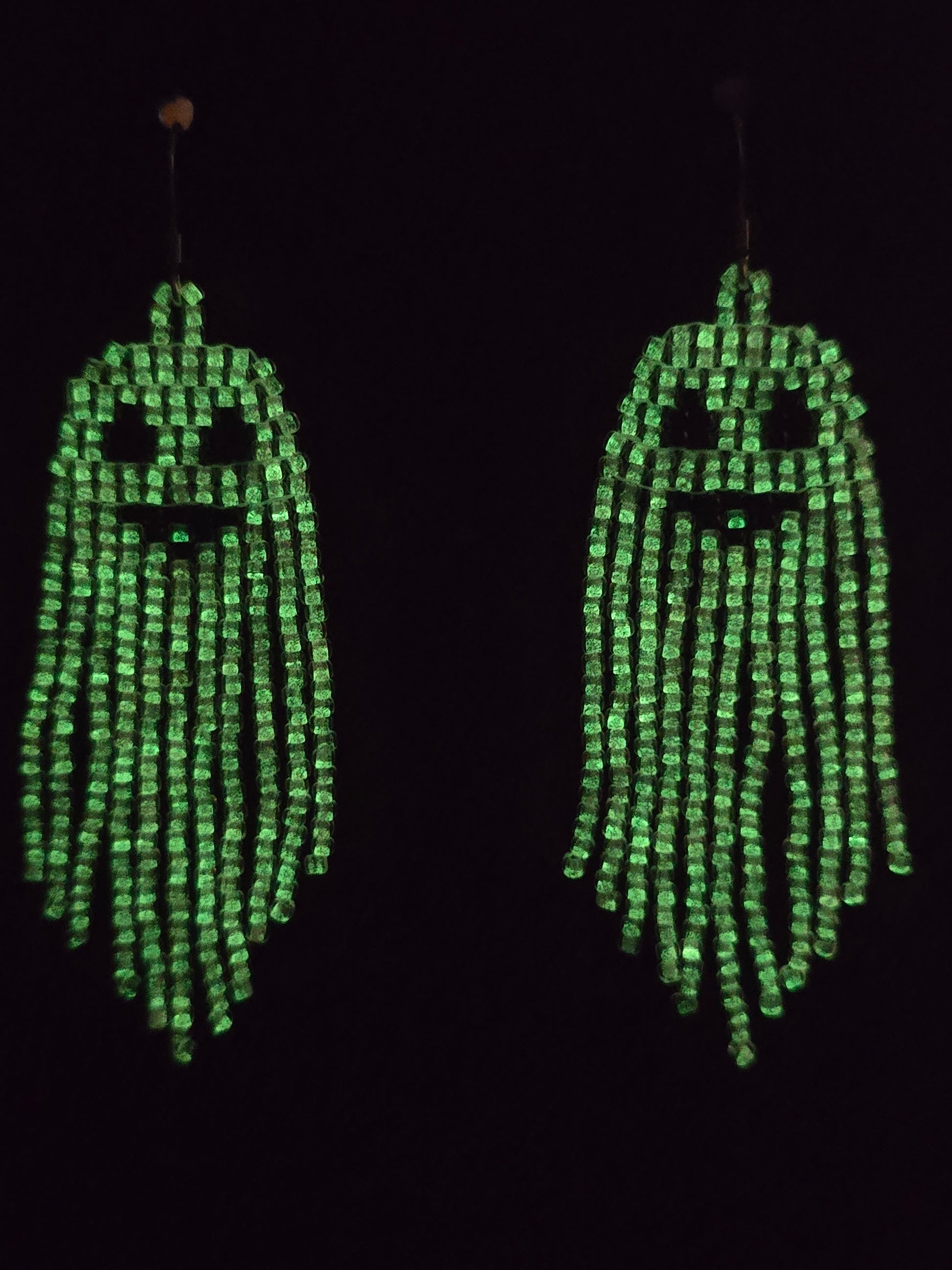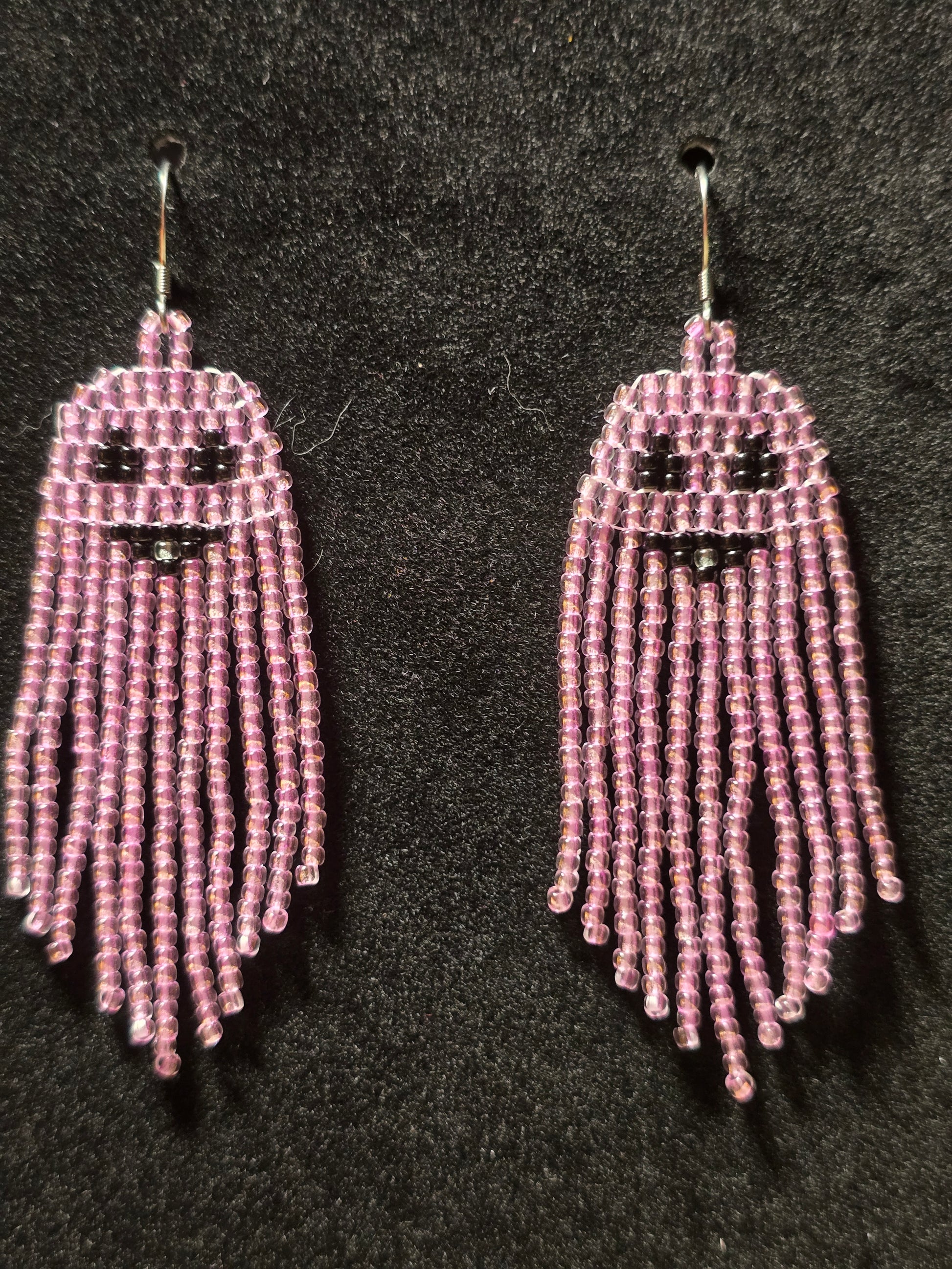 Beaded fringe earrings designed like a ghost colors are pink (glow in the dark {green}) and black 11/0 jsb beads. Stainless Steel Hooks. Size is 3".