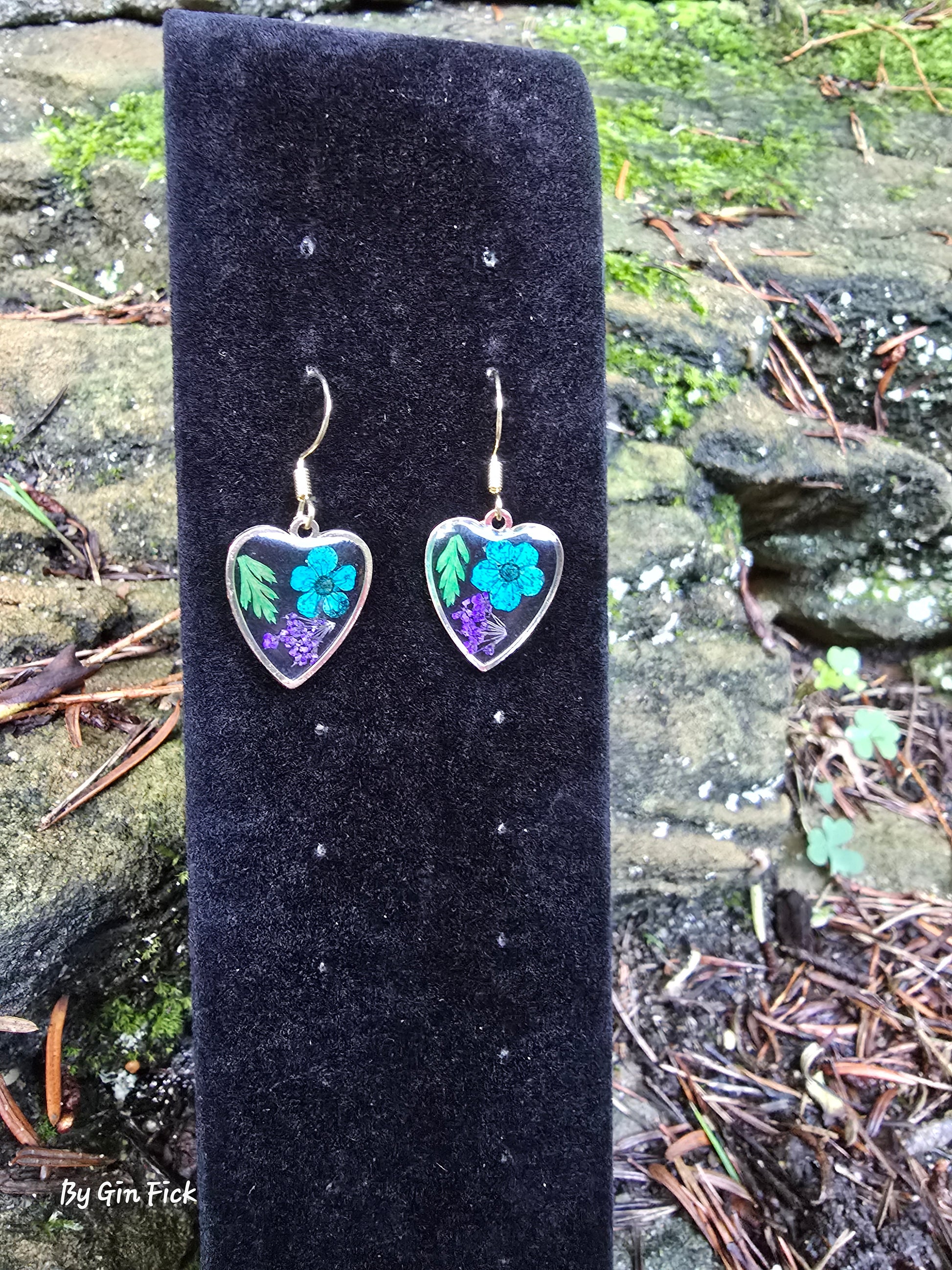 Resin Heart Charm with flowers. 18k gold plated hooks.